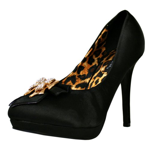 This pair of black satin high heeled pumps have a padded insole & are fully lined in leopard print material. These dressy shoes have a small platform & are beautifully finished in a high polished gold tone bow that is encrusted in crystal rhinestones.Factory Packaged & Boxed